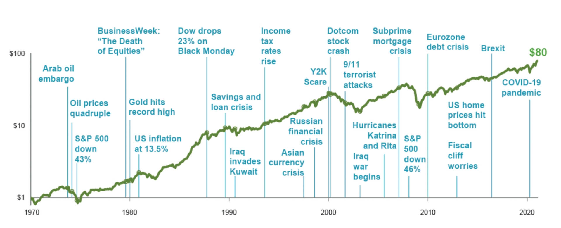 It is good to have a plan because plans never change, right? Unfortunately, we all know too well how variables outside our control often impact our lives. Who could have predicted the events of 2022? Russia invading Ukraine, stock and bond markets both being down, high inflation, rising interest rates, fraud and collapse of FTX and contagion to other crypto currencies; all these events are outside our control. Media selling headlines through fear and uncertainty is a given. However, shifting our focus to areas we can control makes fear and uncertainty lose their grip allowing us to press forward confidently. This is seen in the growth of $1 invested in a diversified stock portfolio to $80 from 1970-2020. Perhaps more of your wealth is in your control than you realize. Rather & Kittrell is here to help.