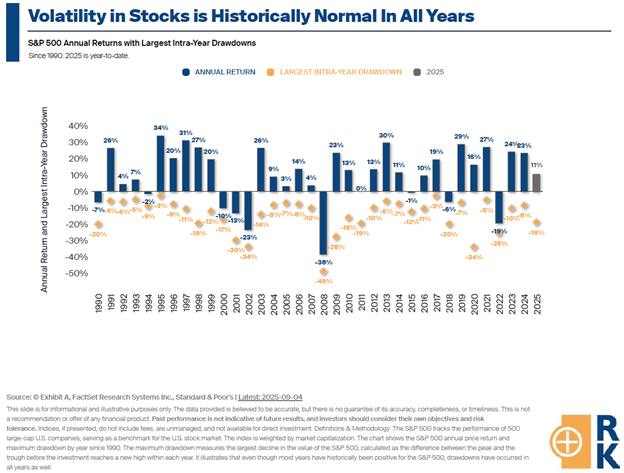 There is a another version of risk where your balance decreases in the short term. This exists anytime you invest, due to the ever-present risk-reward relationship. However, it is noteworthy that this risk differs significantly from the risk of losing all your money. It is normal, and even expected, for a 100% stock portfolio to drop in value at some point every year. The image below shows the S&P 500 since 1990. The yellow represents the most significant drawdown each year, and the navy bar represents where the year actually ended. As you can see, volatility is normal and is not indicative of the year’s outcome.