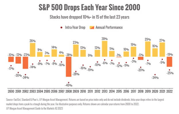 The big takeaway? In 15 of the last 23 years, markets have dropped at least 10% each year.3
