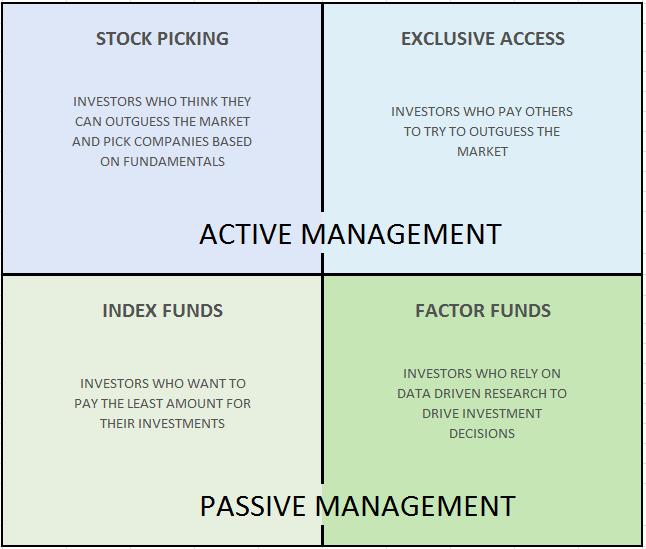 While that is an extremely loaded question, the trend would suggest that more and more investors are jumping over to the passive side of the fence. What I would offer is that investors need to find the best solution that will lead to the fulfillment of their long-term financial goals. Investors typically fall into one of the following categories when they think about the best way to invest in their future.
