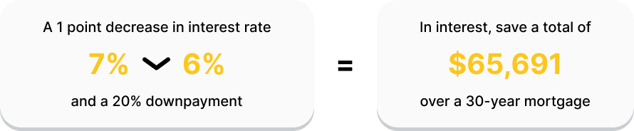 Take, for instance, a home mortgage. Say you’re looking to purchase a $346,900 home. With a 7% mortgage rate and a 20% downpayment, your monthly payment would be $1,846. But if your rate decreases by just 1%, you would pay $1,664, a savings of $182 per month. If you factor this change over a 30-year mortgage, you’d save a total of $65,691* in interest.2