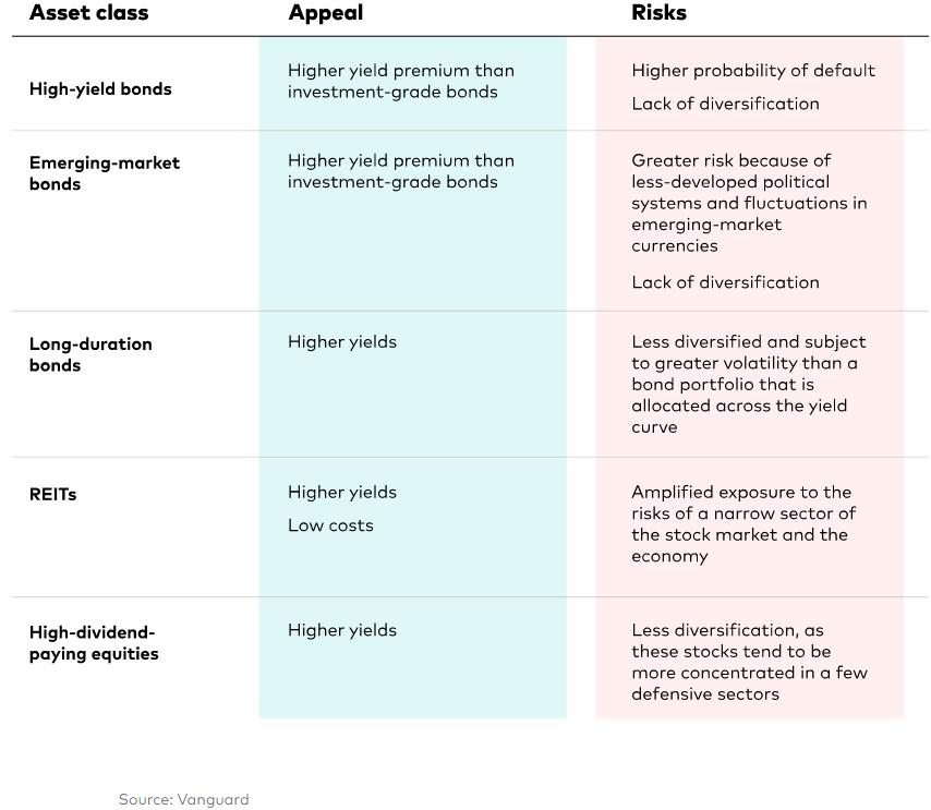 While there are companies paying higher than average dividends, investors must keep in mind that the companies are paying high dividends for a reason. Sometimes those dividends can disappear when times get tough in the economy. For example, bank stocks were paying great dividends before 2008, but many eliminated dividends or only paid 1 cent per share in the aftermath. The table below highlights some of the opportunities and risks that are present in higher-yielding alternatives.