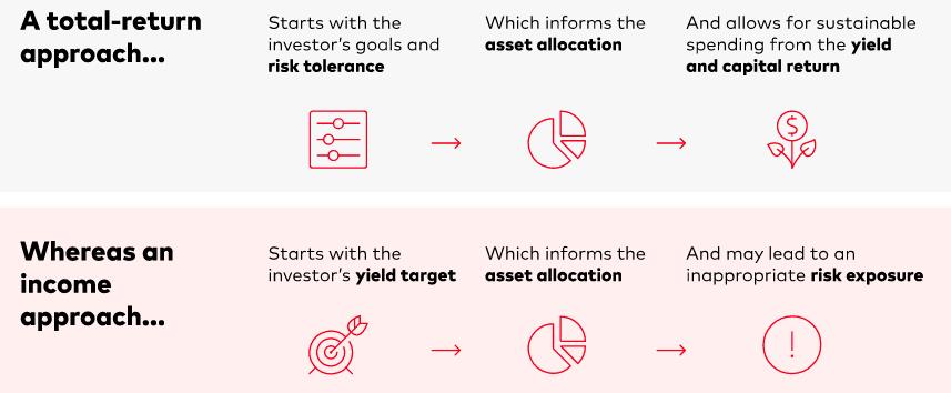When investors target a specific yield, they may be opening themselves up to more risk than they can afford to take. The two different approaches are called “total-return investing” and “income investing.” Both try to solve the same problem but go about doing it differently. As an illustration, it looks like the following: