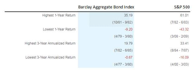 This table shows why bonds are an essential component of a truly diversified portfolio. The worst performing year for bonds was 1979, with the bond market losing 9.20%. That year the Federal Reserve decided to crush the persistent inflation through the mid to late ’70s. The actions taken by the Federal Reserve were highly aggressive and not something that the market had foreseen. The worst three-year period for bonds was an annualized performance of -.67% during the late ’70s.