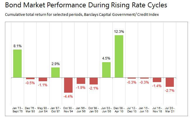 While market punditry would have you believe that rising rates are a disaster for bondholders, the data to back up that claim isn’t there. In fact, in the last five decades, where there have been 13 episodes of rising rates, bond returns during four of those periods were positive, while the others showed only modestly negative returns. The current episode that we see is one of the larger return periods, but that doesn’t necessarily mean that it will stay like that as rates continue to rise. Bonds can have down years, but stocks can perform much worse and for more extended periods.