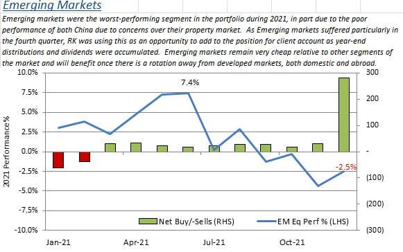 The above was taken from the RK 2021 Trade Activity Summary. It highlights the purchases of Emerging Stocks while they performed poorly in 2021. The bars denote the net number of accounts where the trading activity occurred.